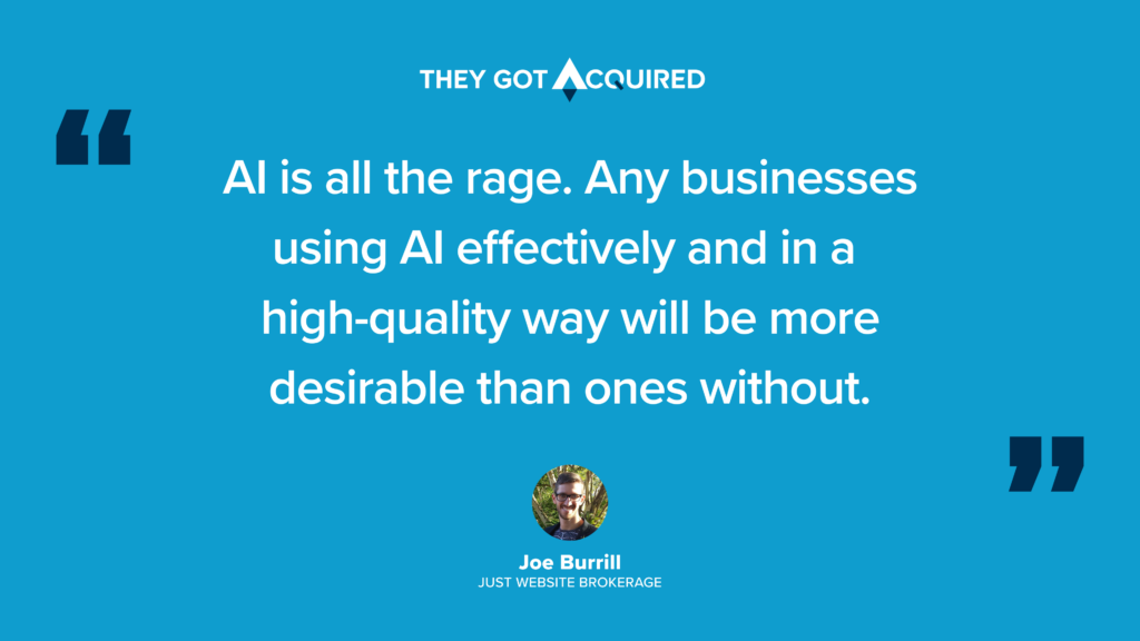 On one hand, “obviously AI is all the rage,” said Joe Burrill, Founder & CEO of Just Website Brokerage. “Any businesses using AI effectively and in a high-quality way will be more desirable than ones without.”
