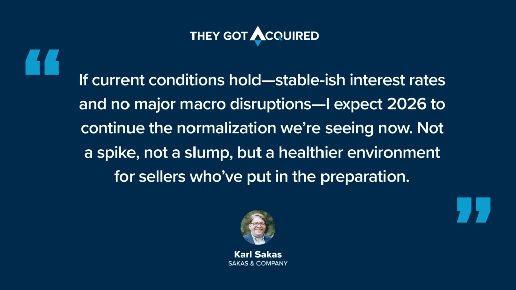 A note on perspective: The advisors we surveyed make their living helping people sell businesses, so they have a natural incentive to be optimistic about market conditions. Their livelihoods depend on active buyers and sellers. While we trust their expertise and frontline insights, it’s worth keeping this context in mind as you read their predictions.